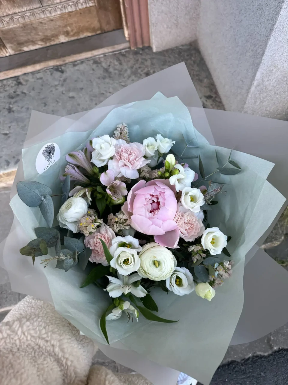 Imeline lillekimp heledates roosades toonides lilledest, mille peakaunitariks heleroosa pojeng:)