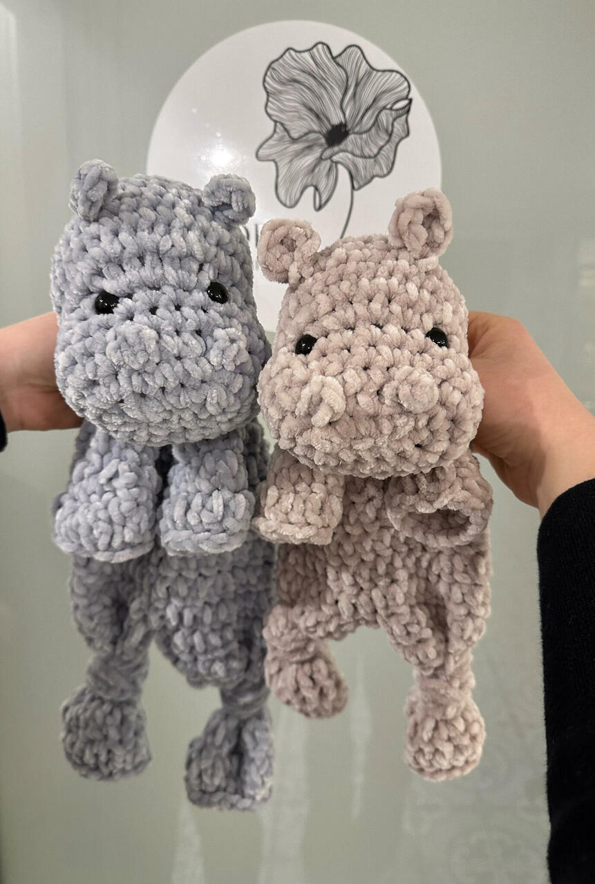 Imearmsad käsitööna valminud jõehobud heegeldatud velvetlõngast. Kingi jõehobu beebipoisi-või tüdruku sünni puhul.