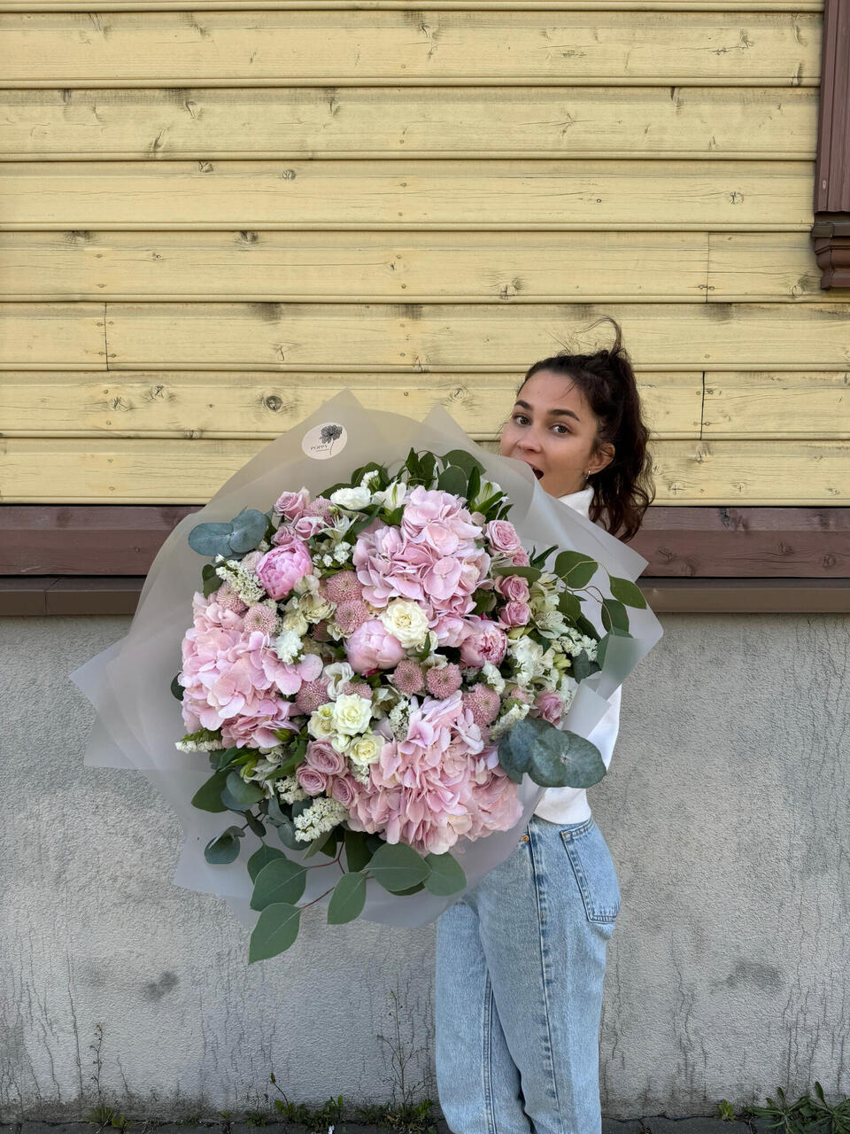 Kõige suuremad õnnesoovid! Kimbus leiate roosad hortensiad koos teiste valgete ja roosade lilledega. Sületäis lilli, mis ületab kõik ootused!