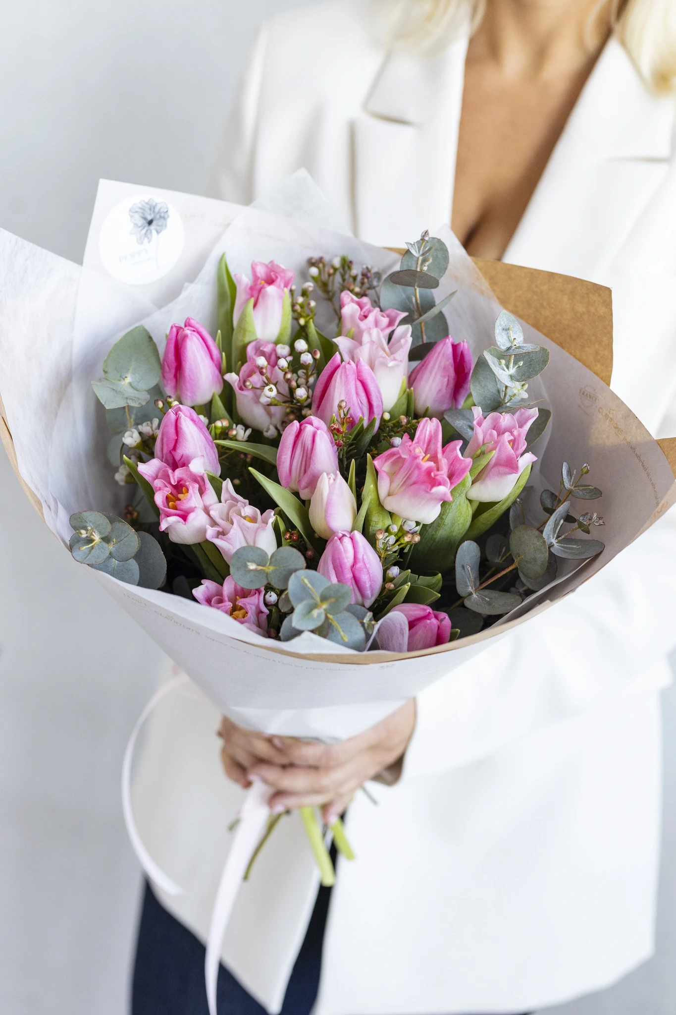 Suur lillekimp roosadest ja heledatest tulpidest koos eukalüpti ja sidrunmürdiga.