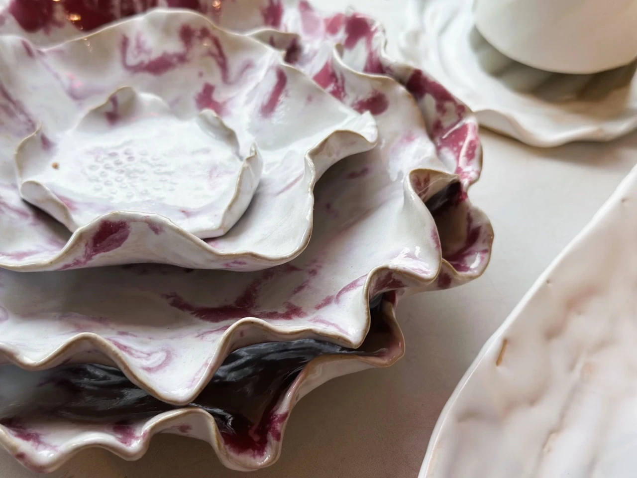 Kunstnik Kristina Volar poolt loodud käsitöö keraamika. Heleroosasse komplekti kuulub 4 kaussi-alust, mille peale saab asetada nii küünlaid, kui muud head-paremat. Tumeroosas komplektis 3 kausikest.