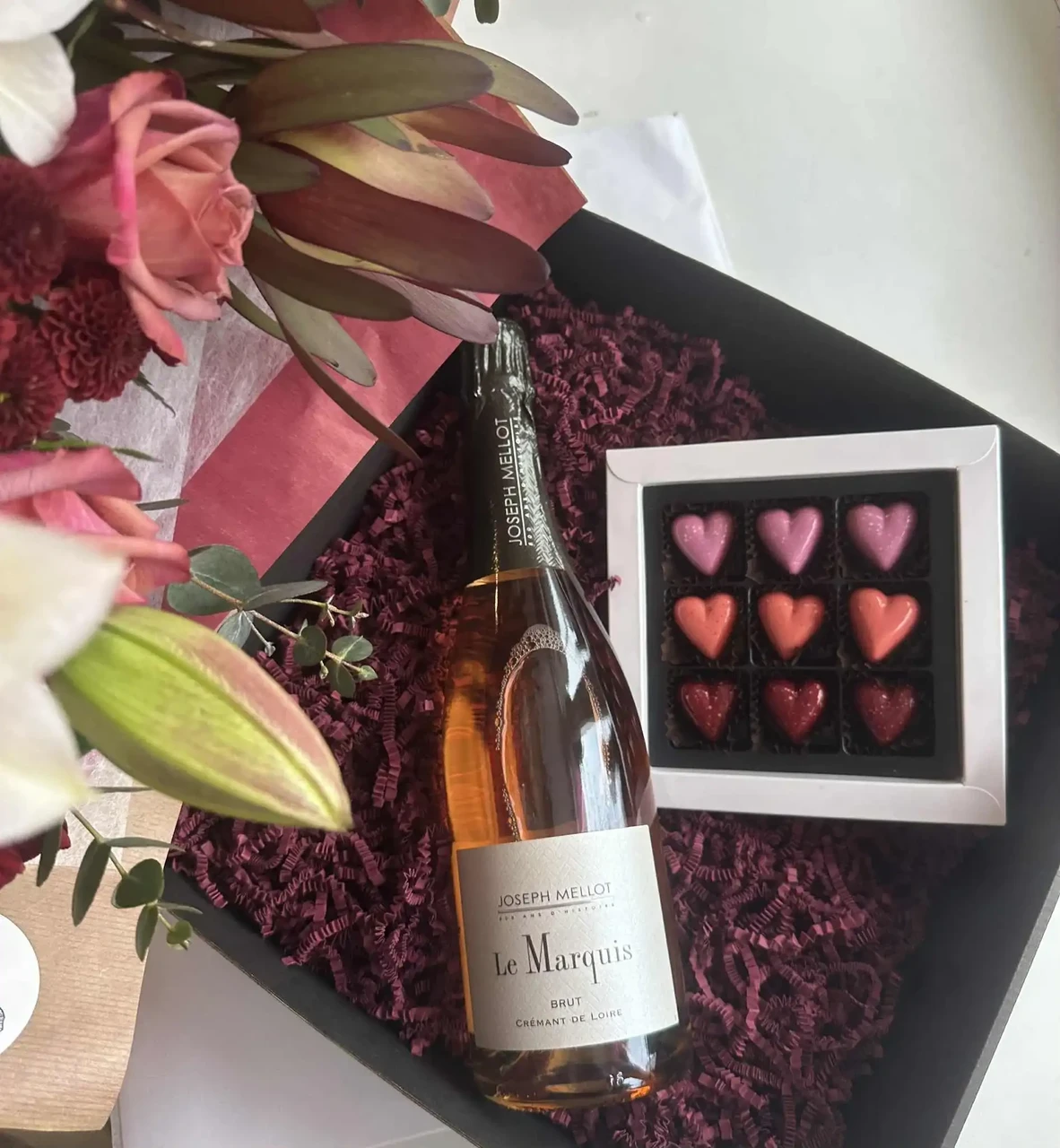 Lisa enda valitud lillekimbule kinkekomplekt, millest leiad Mon Laurée väikeste südametega suussulavad käsitöö šokolaadikommid ning värske puuviljasemaitsega roosa vahuveini, Joseph Mellot Crémant de Loire Brut Rosé.