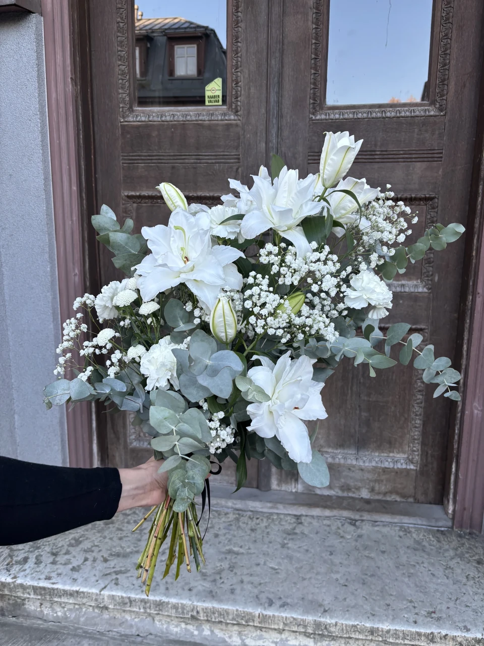 Leinakimp erinevatest valgetest õitest, eukalüptiokstest ja teistest sobivatest materjalidest. Seotud musta lindiga.