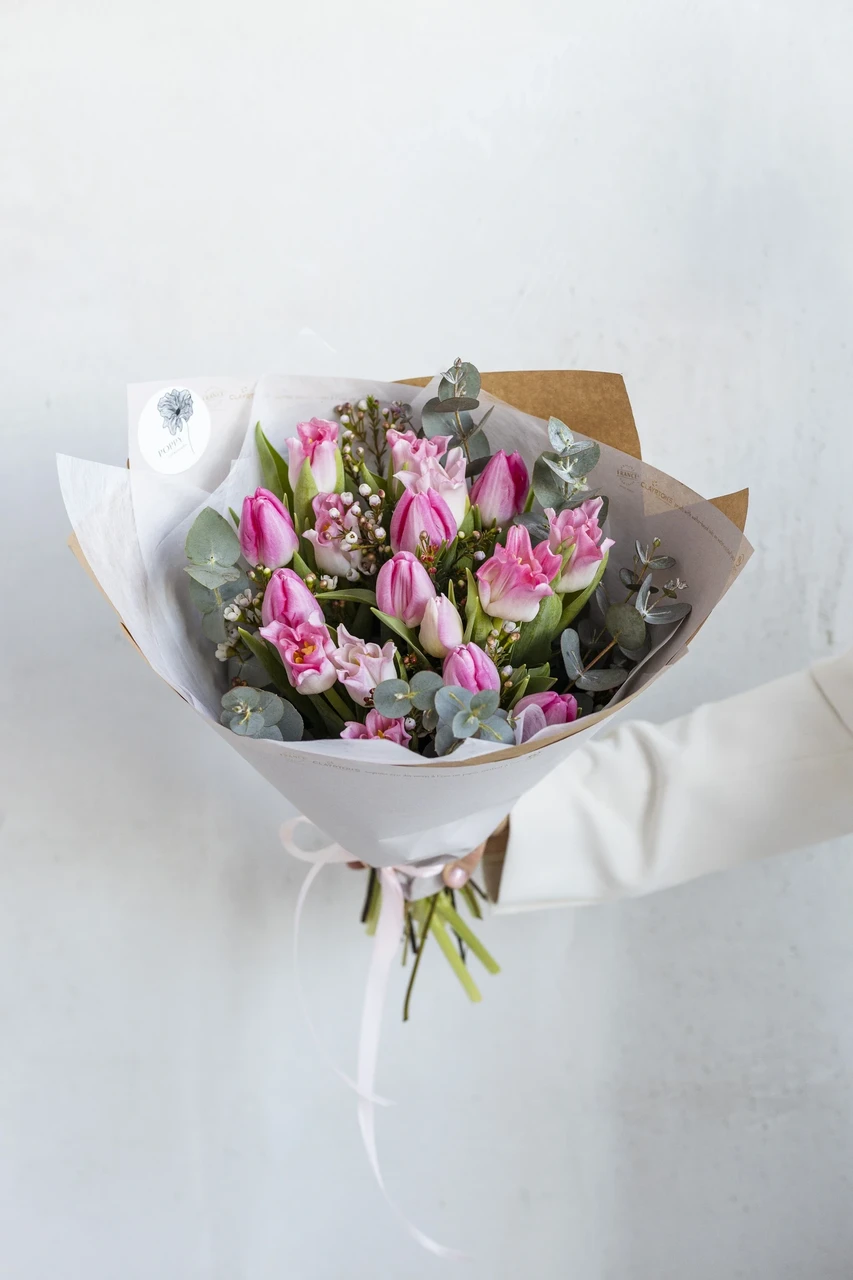 Suur lillekimp roosadest ja heledatest tulpidest koos eukalüpti ja sidrunmürdiga.