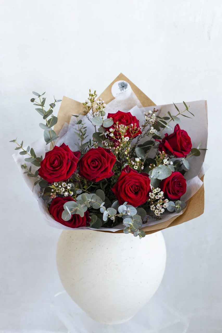 Romantiline lillekimp punastest Equadori roosidest, sidrunmürdist ning eukalüptiokstest